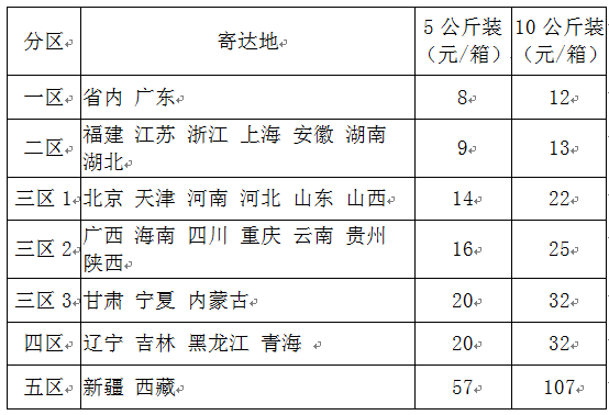 1)江西、浙江、上海、廣東、江蘇、安徽、湖南、湖北、福建,20元/箱(10公斤裝),15元/箱(5公斤裝);